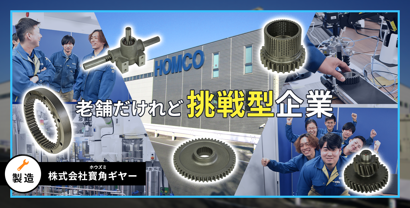 寳角(ホウズミ)ギヤーは歯車を造る会社です。歯車とは、自動車やオートバイ、建設機械、農業機械、印刷機、野菜裁断機など、ありとあらゆる製品の中で働いている部品です。地味なイメージがあるかもしれませんが、役割は主役級の役割を担うものです。90万社ほどある日本の製造業で、0.1%ほどの会社しか歯車製造に携わっていません。当社は創業以来100年以上もの間、業界のパイオニアとして活動を続けています。これからも製造業を支えられるよう、設備や技術力を高める挑戦を続けていきたいと考えています。